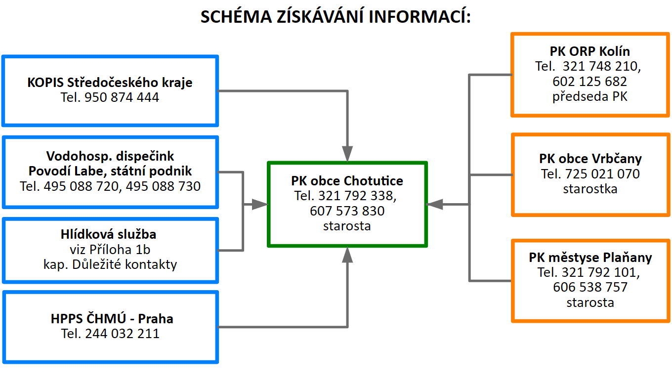 | 1 | Dlouhodobý déšť / tání / ledové jevy | Monitorování údajů vodoměrných stanic, sledování hydrologických údajů na webových stránkách podniku Povodí Labe, státní podnik a ČHMÚ. | Předseda PK, členové PK | Podnik Povodí Labe, státní podnik; ČHMÚ |