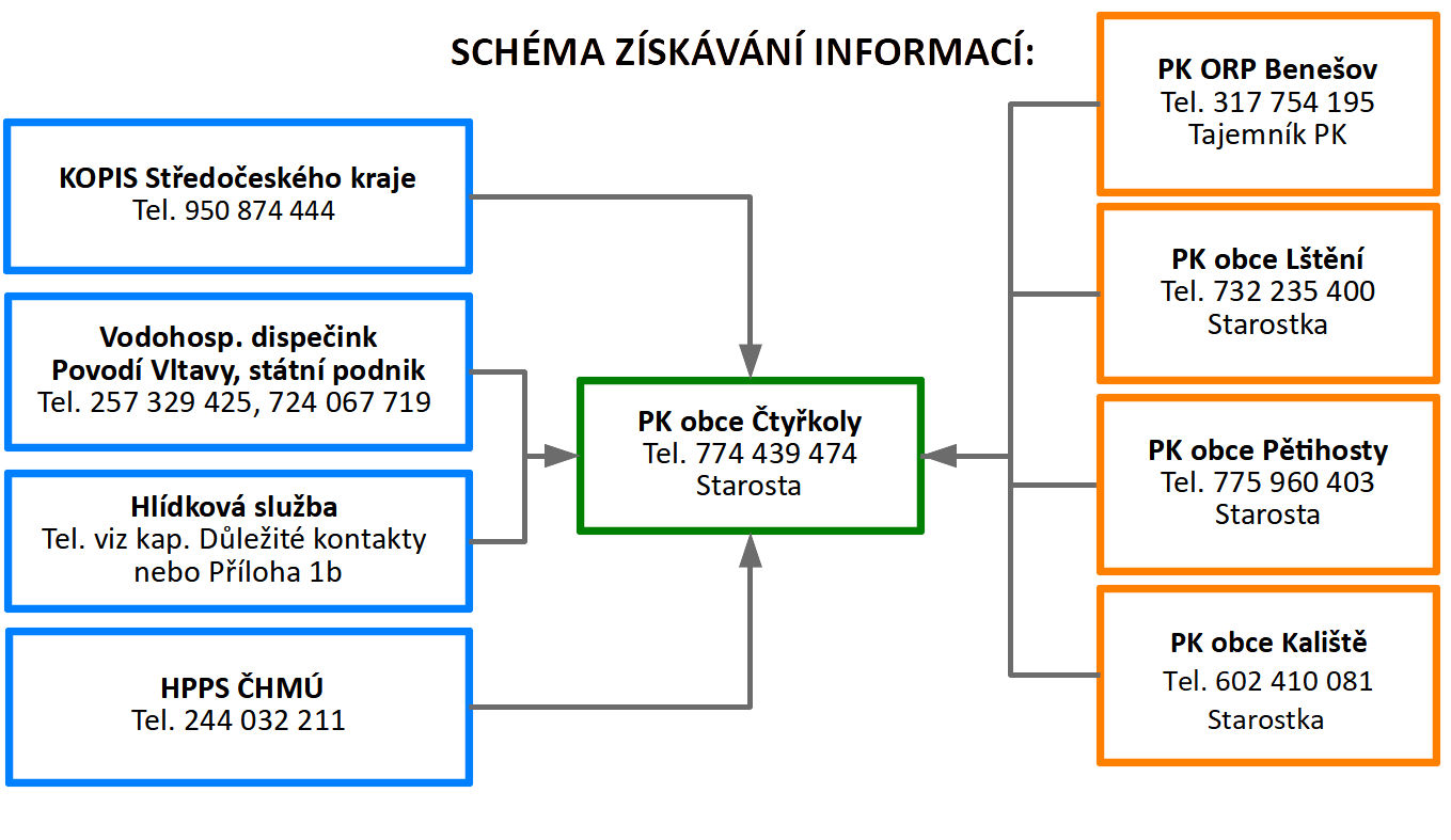 | 4 | Další vzestup hladiny s nepříznivou prognózou. | Svolání krizového štábu obce. | Předseda PK | KOPIS HZS Středočeského kraje |