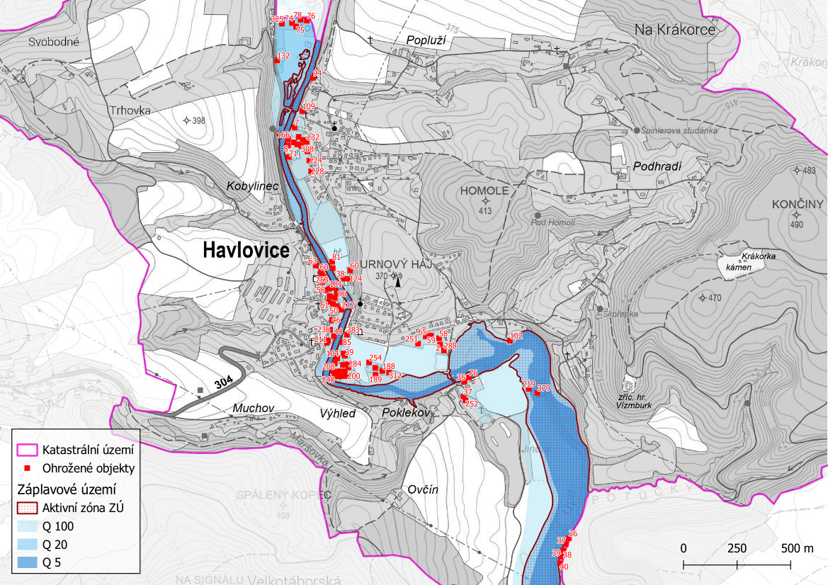 Ohrožené objekty na území obce Havlovice s vyznačeným záplavovým územím