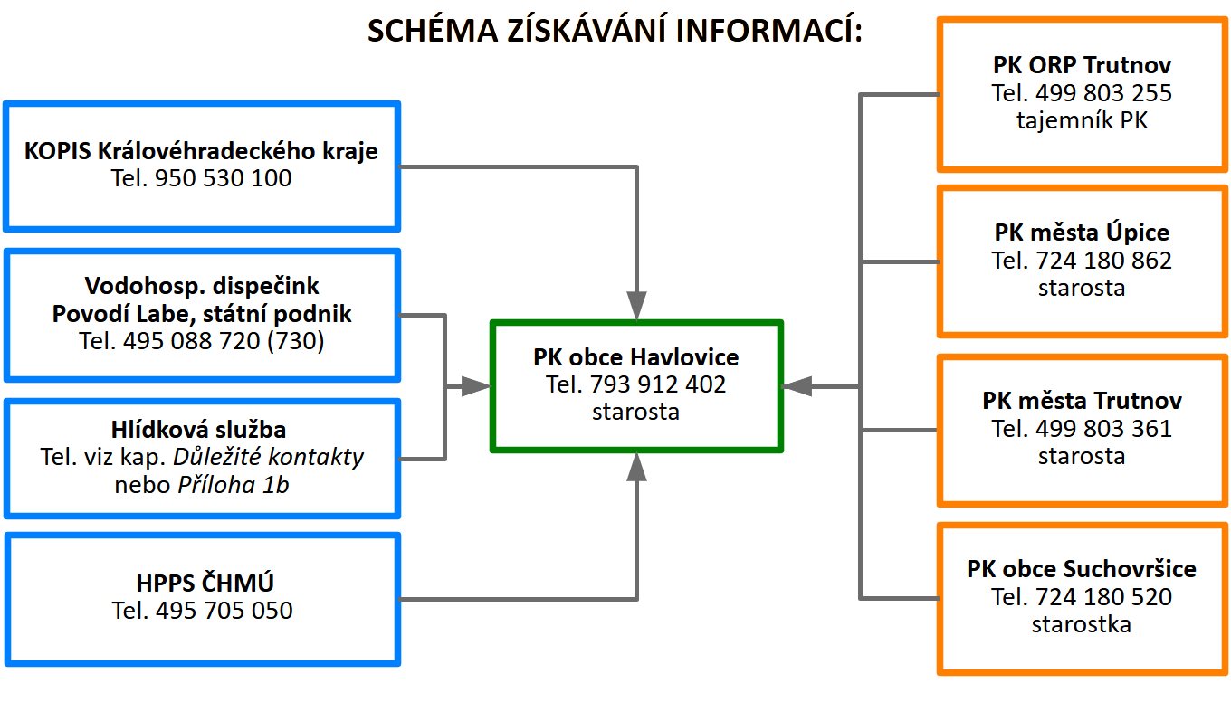 | 4 | Další vzestup hladin s nepříznivou prognózou | Svolání krizového štábu obce. | Předseda PK | KOPIS HZS Královéhradeckého kraje |