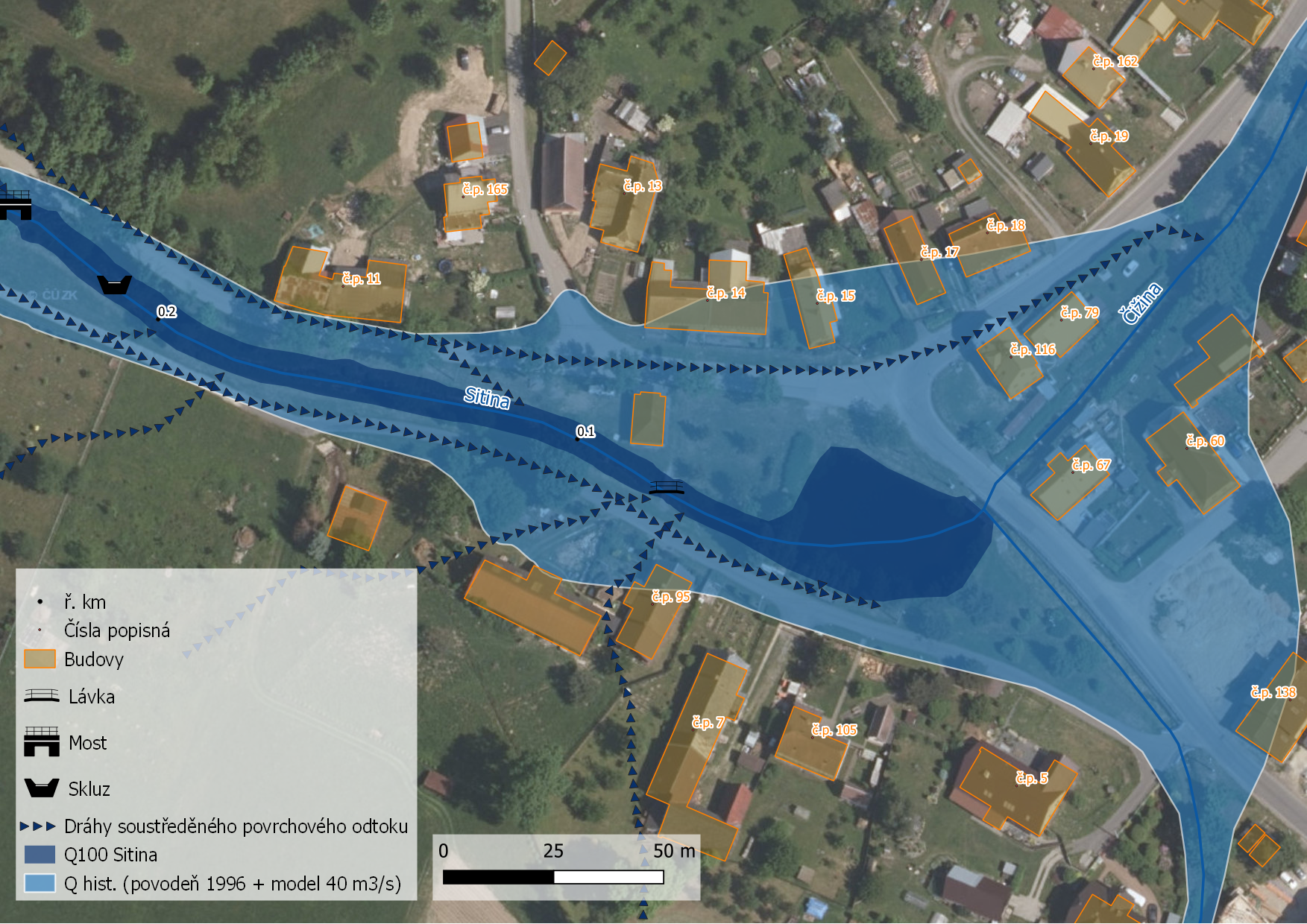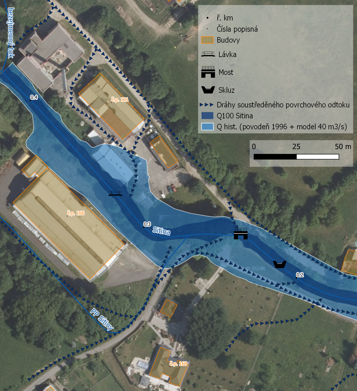 Pro potřeby povodňového plánu byl pro tok Sitina zpracován rozliv historické povodně z roku 1996 a taktéž dle hydrologického modelu vypočítána kapacita koryta v intravilánu. Dle odtokového modelu je koryto toku Sitina v intravilánu města kapacitní na průtok Q100 (16,7 m3/s). To koresponduje s projektovou dokumentací dodanou správcem toku (LČR, s.p.), kde bylo koryto toku v roce 1989 upraveno na průtok 16,8 m3/s. Kritická však stále mohou být místa lávek, mostů a dalších objektů křižující vodní tok. Rozliv povodně v roce 1996 byl vykreslen na základě hydrologického modelu a dobových fotografií. Pro současný stav koryta toku byl do hydrologického modelu dosazen průtok 40m3/s, který svým rozsahem nejvíce odpovídá zmiňované povodni. Jedná se však o extrémní průtok vysoko nad hodnotou stoleté vody dle dat ČHMÚ.