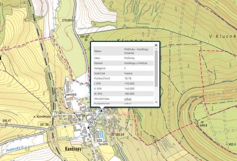 Hlásný profil kat. C je umístěn na kamenném mostu v Konětopech, místní části obce Pnětluky, u objektu č. p. 4. Nula vodočtu je v nadmořské výšce 283,52 m.