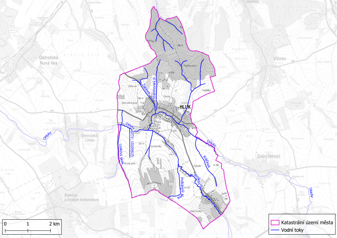 Městem Hluk protéká říčka Okluky, která pramení v Bílých Karpatech na západním úbočí vrchu Lesná (696 m n. m.) v nadmořské výšce 600 m. Na počátku toku směřuje severozápadně, od Dolního Němčí pak teče západním směrem. Protéká obcemi Horní Němčí, Slavkov, Dolní Němčí, Hluk, Ostrožská Lhota a Uherský Ostroh, kde se z levé strany vlévá do řeky Moravy v nadmořské výšce 178 m n. m.