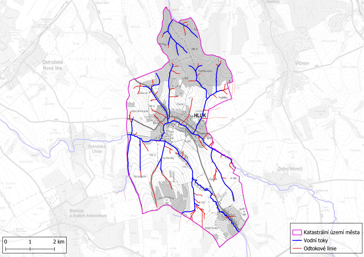 V rámci projektu "Strategie ochrany před negativními dopady povodní a erozními jevy přírodě blízkými opatřeními v České republice" byla vytvořena mapová kompozice odtokové poměry, z níž je čerpáno v následujícím grafickém výstupu. Jedná se o identifikaci odtokových linií (dráhy přímého povrchového odtoku) s přispívající plochou povodí > 5 ha. Tyto odtokové linie mohou dát za vznik soustředěnému povrchovému odtoku, který může způsobit škody na území města Hluk. Odtokové linie nezohledňují aktuální využití pozemků ani jiné skutečnosti, které mají vliv na přerušení soustředěného povrchového odtoku.