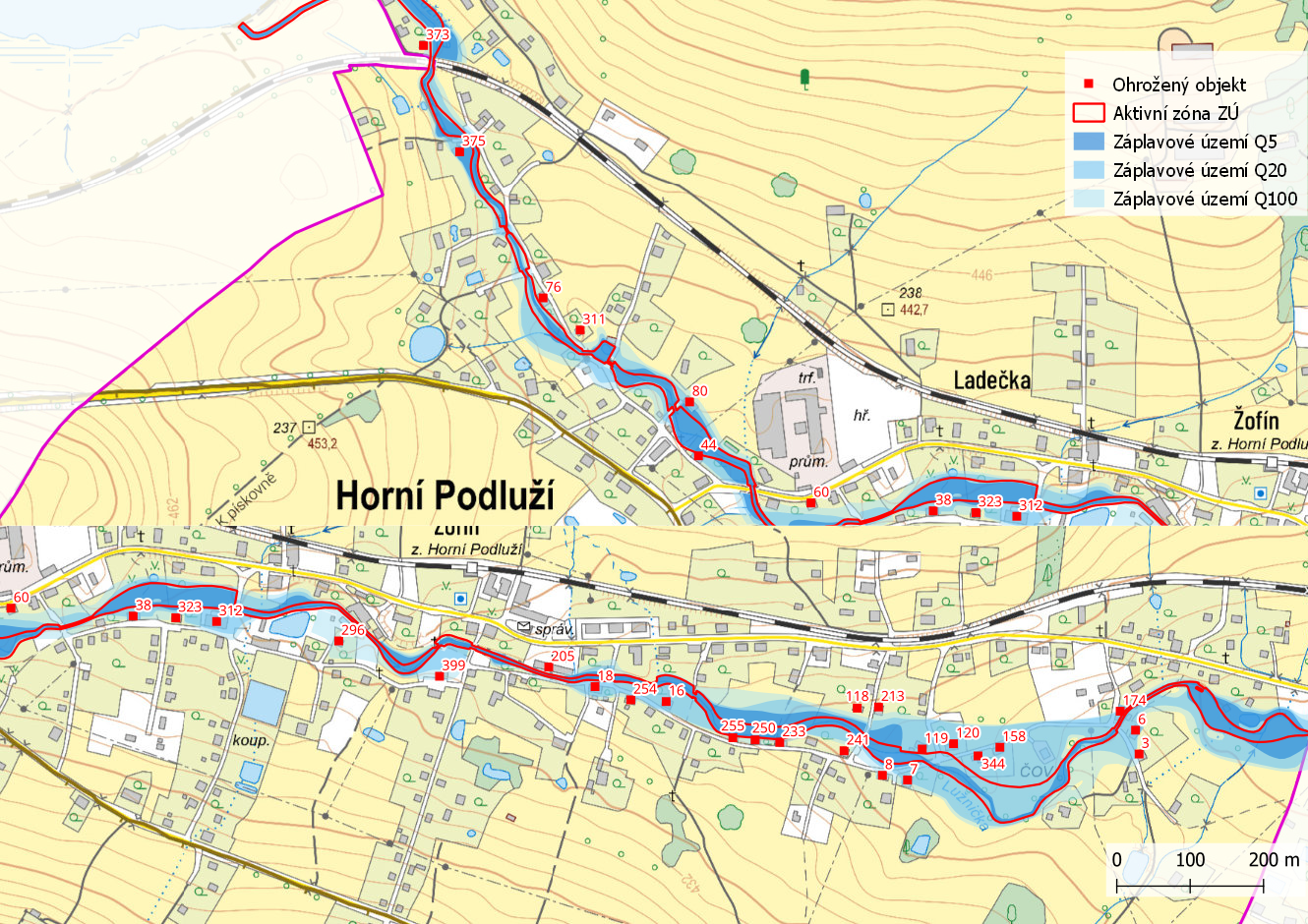 Ohrožené objekty na území obce Horní Podluží s vyznačeným záplavovým územím