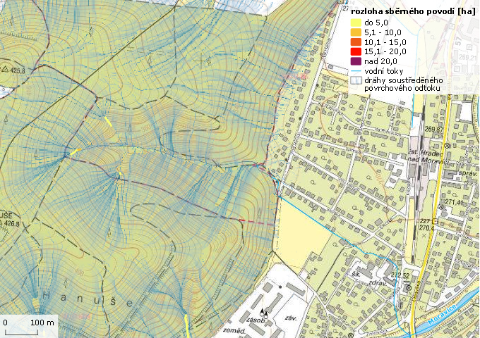 Dráhy soustředěného povrchového odtoku v oblasti kopce Hanuše
