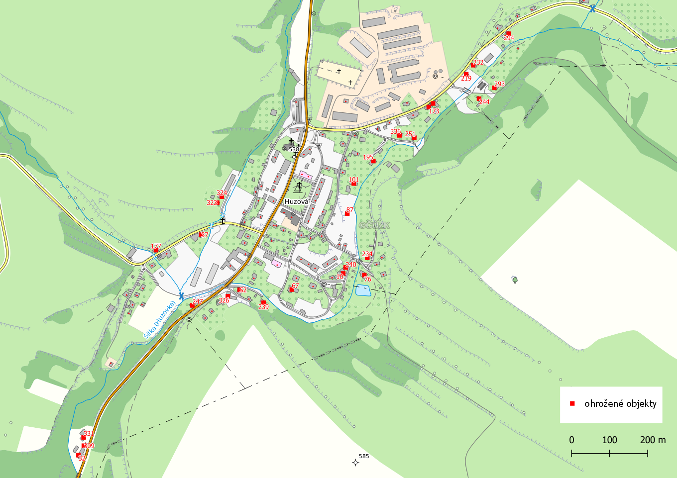 V záplavovém území vodních toků v katastru obce se nachází ČOV Huzová, která by mohla být při povodni zdrojem ohrožení (např. vlivem úniku nebezpečných látek či uvolnění většího množství materiálu do vodního toku).