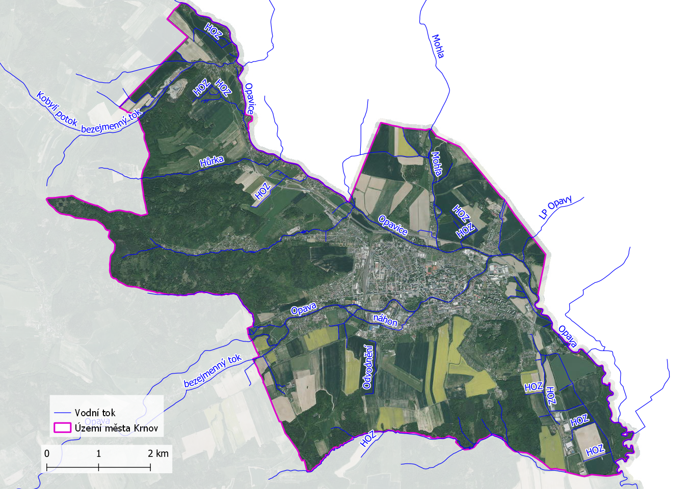 Nejvýznamnější vodní tok, z hlediska povodňového ohrožení, na území města Krnov je řeka Opava. Číslo hydrologického pořadí 2-02-01-0370, 2-02-01-0600. Zdrojnice Opavy pramení v Hrubém Jeseníku a stékají se ve Vrbně pod Pradědem. Z Vrbna pod Pradědem teče řeka Nízkým Jeseníkem k jihovýchodu korytem, které po povodni roku 1997 dostalo přírodě blízký ráz – je tvořeno četnými meandry, štěrkovými terasami a ostrůvky. V Nových Heřminovech se obrací k severovýchodu, kterýžto směr si udržuje až ke Krnovu ve Zlatohorské vrchovině. Celý úsek od Vrbna až do Krnova má horský charakter, řeka teče hlubokým údolím, ve kterém vytváří četné peřeje. Pod Krnovem se údolí otevírá a řeka již teče nížinou Opavské pahorkatiny zhruba jihovýchodním směrem až k ústí do Odry v Ostravě-Svinově. Celková délka řeky je 110,7 km a plocha povodí 2 089,0 km2.