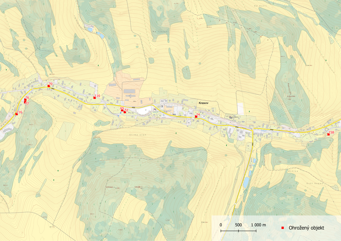 V obci Krasov není oficiálně stanovené záplavové území, přesto bylo vybráno několik ohrožených objektů podle zkušeností z minulých let.