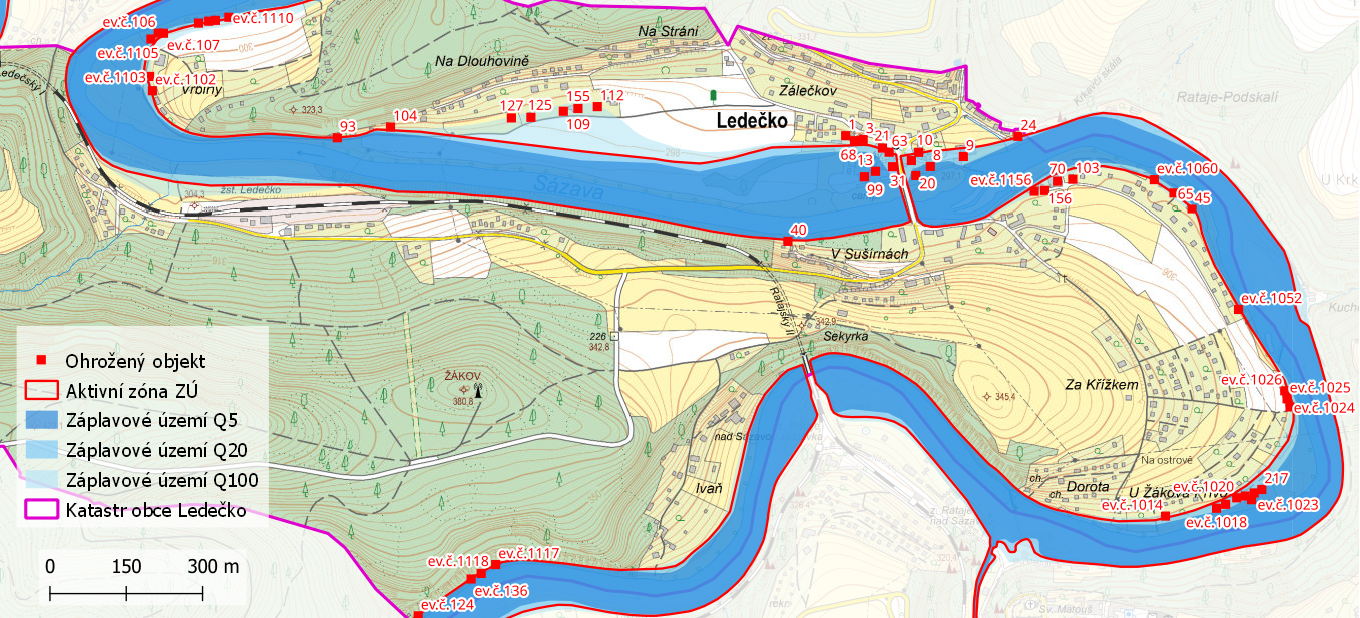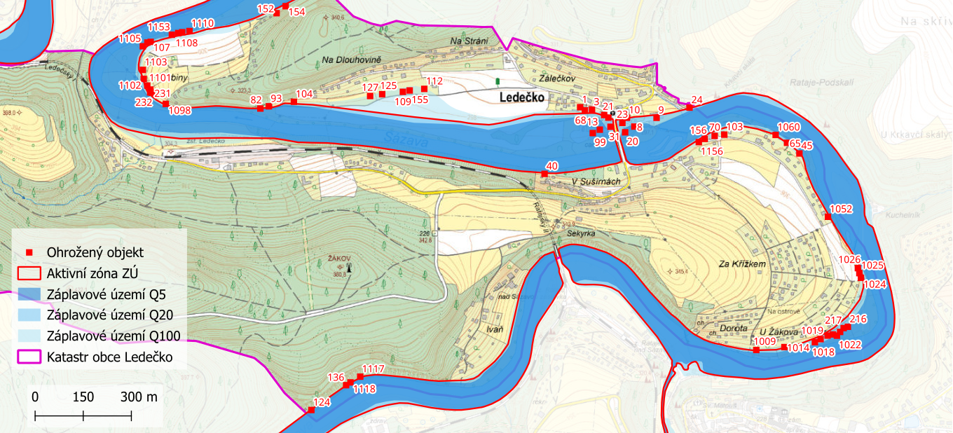 Ohrožené objekty na území obce Ledečko s vyznačeným záplavovým územím