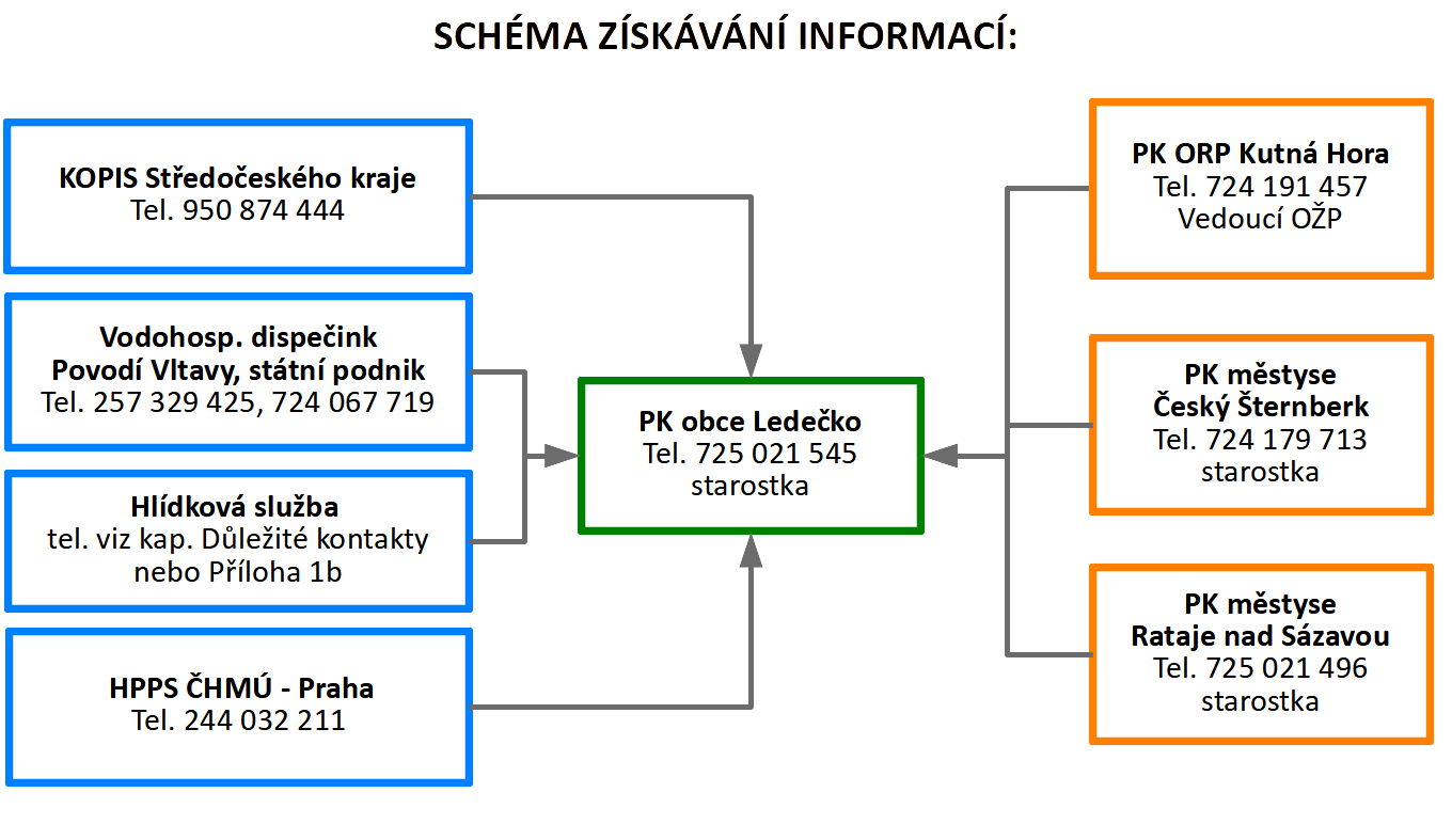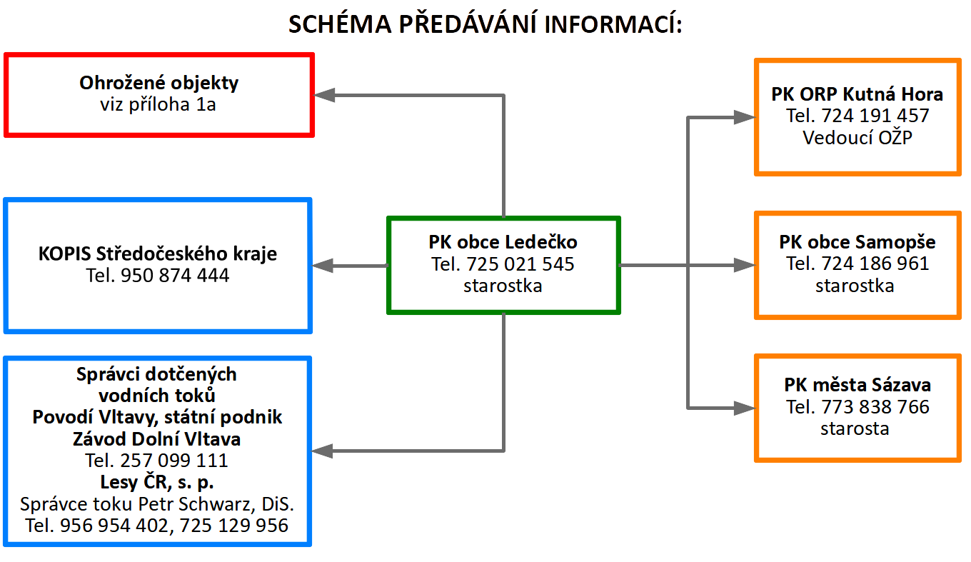 | 4 | Další vzestup hladin s nepříznivou prognózou | Svolání krizového štábu obce. | Předseda PK | KOPIS HZS Středočeského kraje |