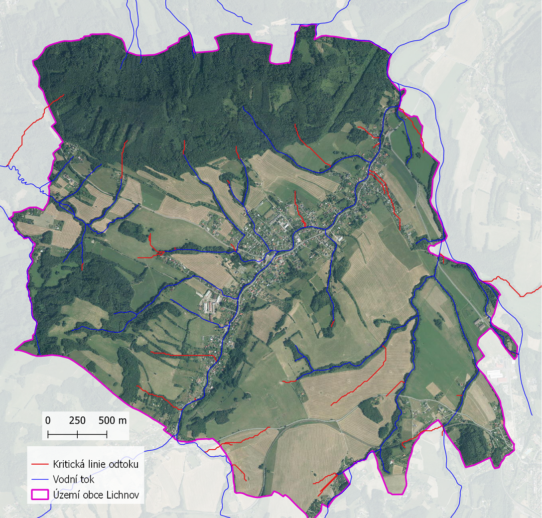 V rámci projektu "Strategie ochrany před negativními dopady povodní a erozními jevy přírodě blízkými opatřeními v České republice" byla vytvořena mapová kompozice odtokové poměry, z níž je čerpáno v následujícím grafickém výstupu. Jedná se o identifikaci odtokových linií (dráhy přímého povrchového odtoku) s přispívající plochou povodí > 5 ha. Tyto odtokové linie mohou dát za vznik soustředěnému povrchovému odtoku, který může způsobit škody na území obce Lichnov. Odtokové linie nezohledňují aktuální využití pozemků ani jiné skutečnosti, které mají vliv na přerušení soustředěného povrchového odtoku.