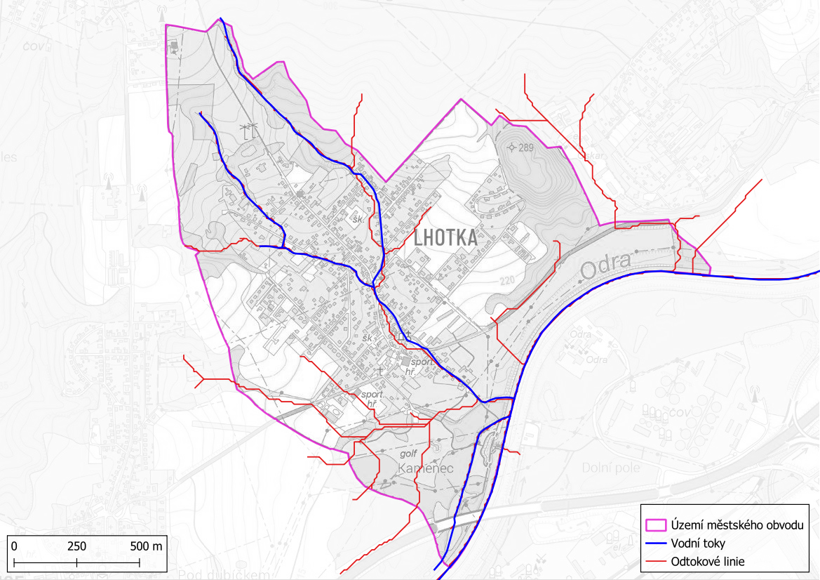 V rámci projektu "Strategie ochrany před negativními dopady povodní a erozními jevy přírodě blízkými opatřeními v České republice" byla vytvořena mapová kompozice odtokové poměry, z níž je čerpáno v následujícím grafickém výstupu. Jedná se o identifikaci odtokových linií (dráhy přímého povrchového odtoku) s přispívající plochou povodí > 5 ha. Tyto odtokové linie mohou dát za vznik soustředěnému povrchovému odtoku, který může způsobit škody na území městského obvodu Lhotka. Odtokové linie nezohledňují aktuální využití pozemků ani jiné skutečnosti, které mají vliv na přerušení soustředěného povrchového odtoku.