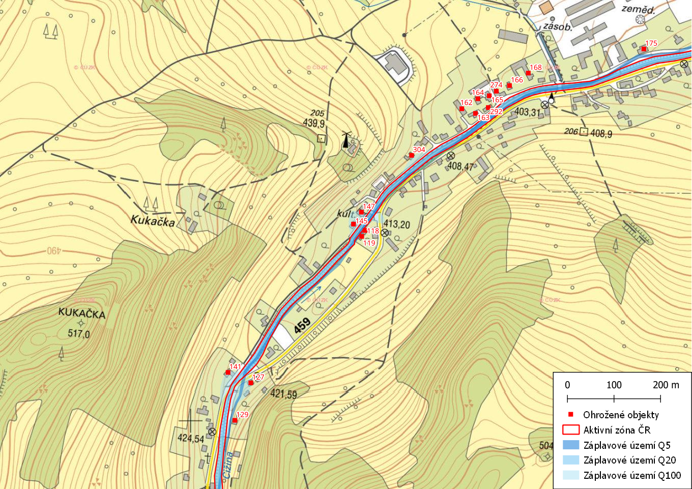 Tyto objekty je nutno varovat, případně evakuovat. Objekty byly stanoveny především na základě historických zkušeností s povodněmi v obci.