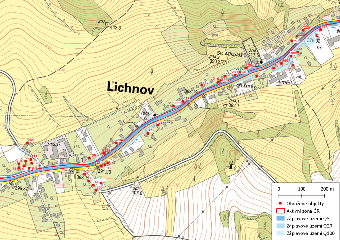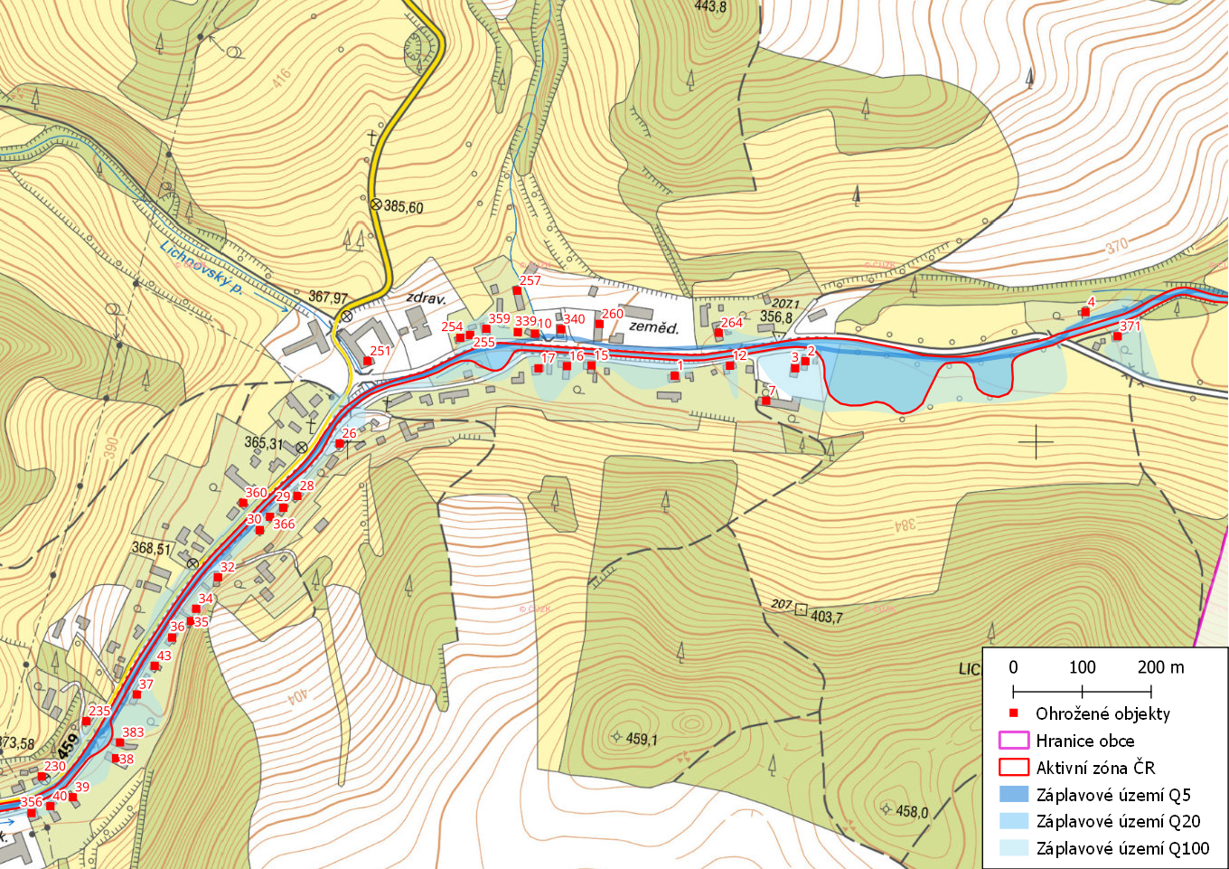 Ohrožené objekty na území obce Lichnov s vyznačeným záplavovým územím
