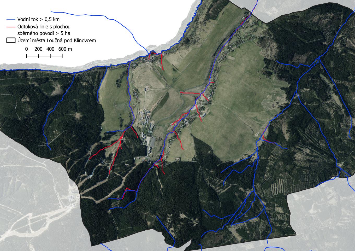 V rámci projektu "Strategie ochrany před negativními dopady povodní a erozními jevy přírodě blízkými opatřeními v České republice" byla vytvořena mapová kompozice odtokové poměry, z níž je čerpáno v následujícím grafickém výstupu. Jedná se o identifikaci odtokových linií (dráhy přímého povrchového odtoku) s přispívající plochou povodí větší než 5 ha. Tyto odtokové linie mohou dát za vznik soustředěnému povrchovému odtoku, který může způsobit škody na území města Loučná pod Klínovcem. Odtokové linie nezohledňují aktuální využití pozemků ani jiné skutečnosti, které mají vliv na přerušení soustředěného povrchového odtoku.