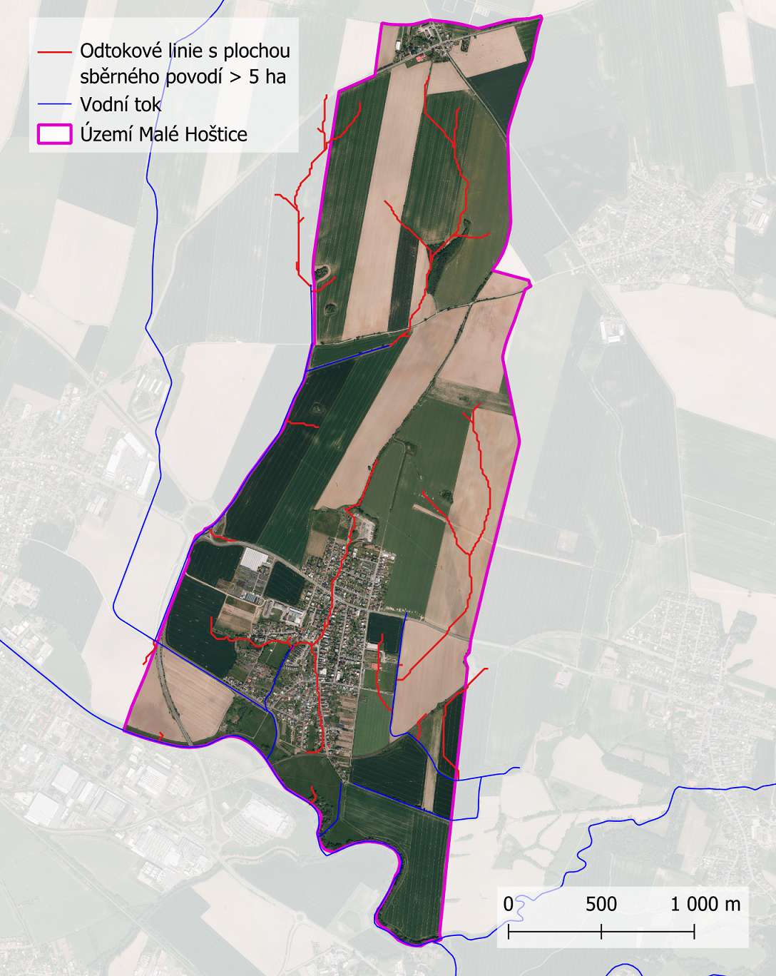V rámci projektu "Strategie ochrany před negativními dopady povodní a erozními jevy přírodě blízkými opatřeními v České republice" byla vytvořena mapová kompozice odtokové poměry, z níž je čerpáno v následujícím grafickém výstupu. Jedná se o identifikaci odtokových linií (dráhy přímého povrchového odtoku) s přispívající plochou povodí > 5 ha. Tyto odtokové linie mohou dát za vznik soustředěnému povrchovému odtoku, který může způsobit škody na území městské části Malé Hoštice. Odtokové linie nezohledňují aktuální využití pozemků ani jiné skutečnosti, které mají vliv na přerušení soustředěného povrchového odtoku.