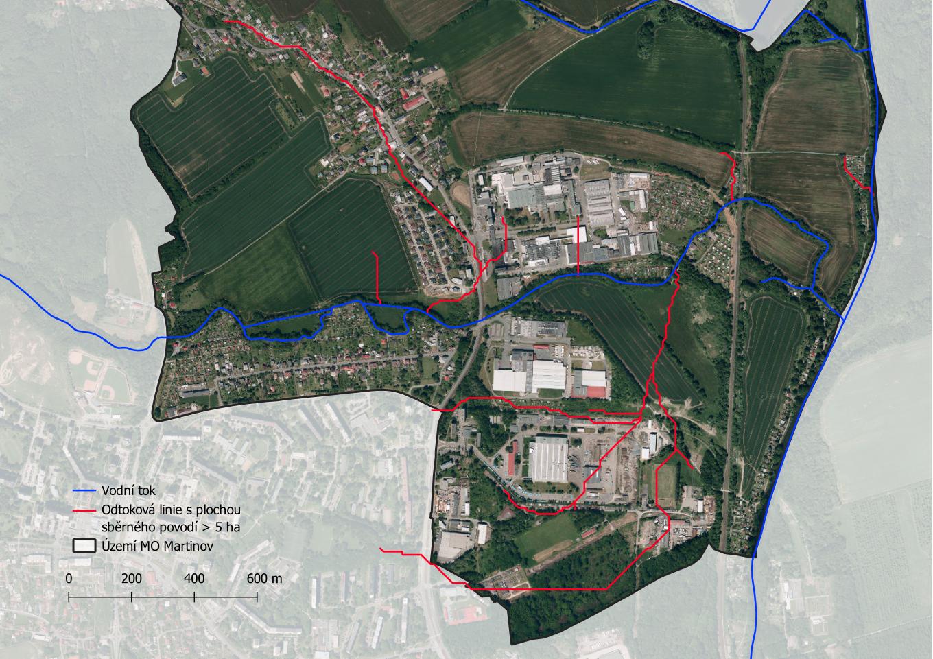 Odtokové linie s plochou sběrného povodí větší než 5 ha na území městského obvodu Martinov