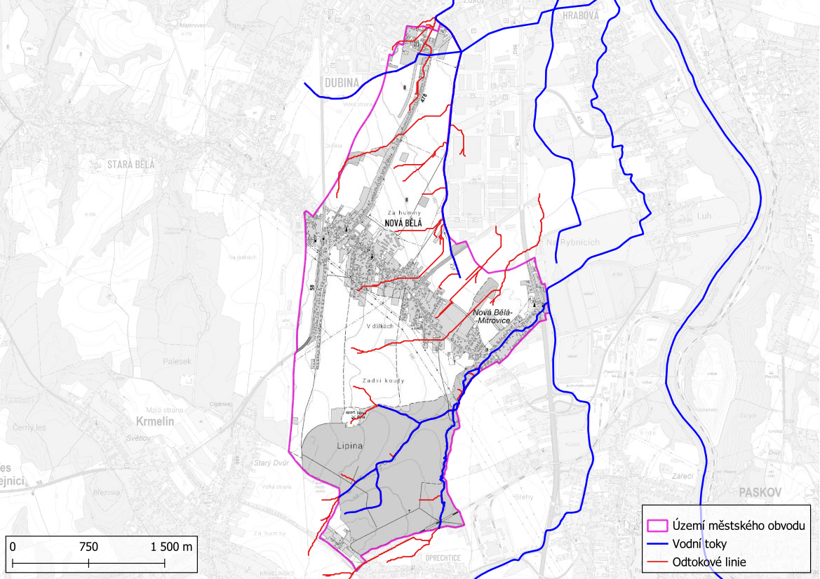 V rámci projektu "Strategie ochrany před negativními dopady povodní a erozními jevy přírodě blízkými opatřeními v České republice" byla vytvořena mapová kompozice odtokové poměry, z níž je čerpáno v následujícím grafickém výstupu. Jedná se o identifikaci odtokových linií (dráhy přímého povrchového odtoku) s přispívající plochou povodí > 5 ha. Tyto odtokové linie mohou dát za vznik soustředěnému povrchovému odtoku, který může způsobit škody na území městského obvodu Nová Bělá. Odtokové linie nezohledňují aktuální využití pozemků ani jiné skutečnosti, které mají vliv na přerušení soustředěného povrchového odtoku.