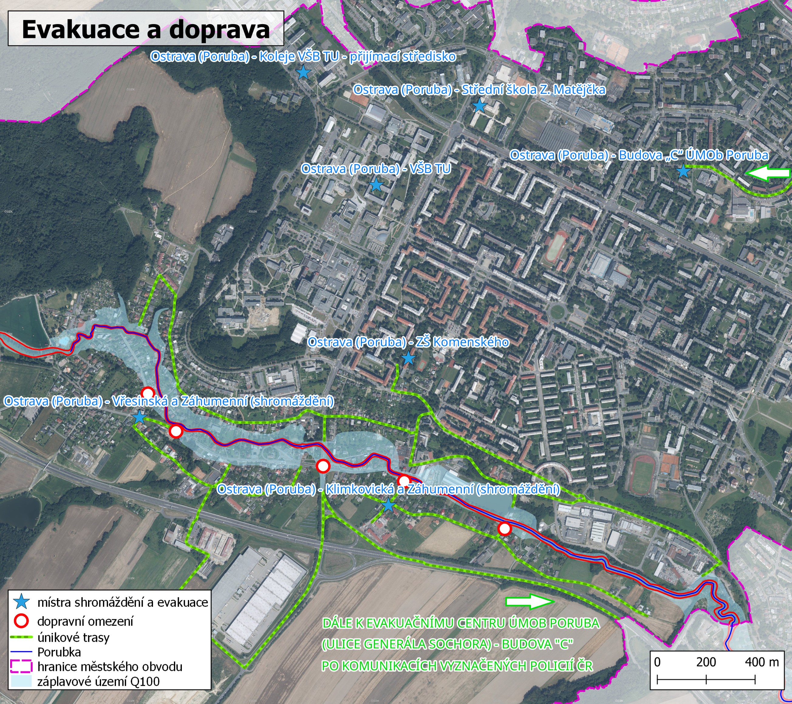 Ústupové trasy jsou vyznačeny v mapě níže. Objízdná trasa bude vedena operativně na základě stavu ostatních silničních komunikací v širším okolí městského obvodu Poruba ve spolupráci s Policí ČR.
