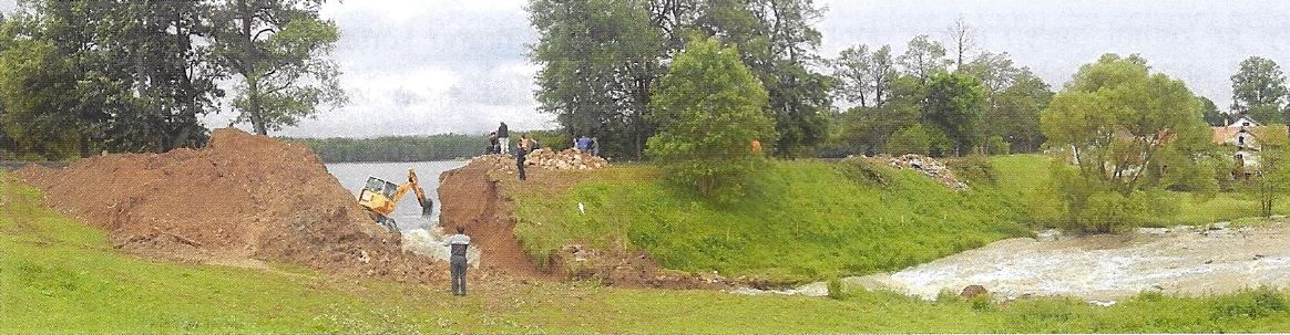 Nouzový přeliv na malé vodní nádrži Kladiny při zvláštní povodni v červenci 2012