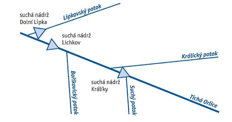 Schéma soustavy suchých nádrží na Tiché Orlici v dotčeném území