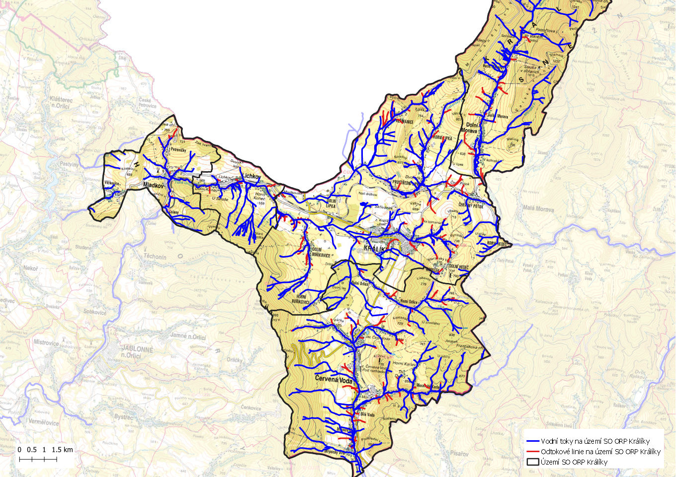 V rámci projektu "Strategie ochrany před negativními dopady povodní a erozními jevy přírodě blízkými opatřeními v České republice" byla vytvořena mapová kompozice odtokové poměry, z níž je čerpáno v následujícím grafickém výstupu. Jedná se o identifikaci odtokových linií (dráhy přímého povrchového odtoku) s přispívající plochou povodí větší než 5 ha. Tyto odtokové linie mohou dát za vznik soustředěnému povrchovému odtoku, který může způsobit škody na území SO ORP Králíky. Odtokové linie nezohledňují aktuální využití pozemků ani jiné skutečnosti, které mají vliv na přerušení soustředěného povrchového odtoku.