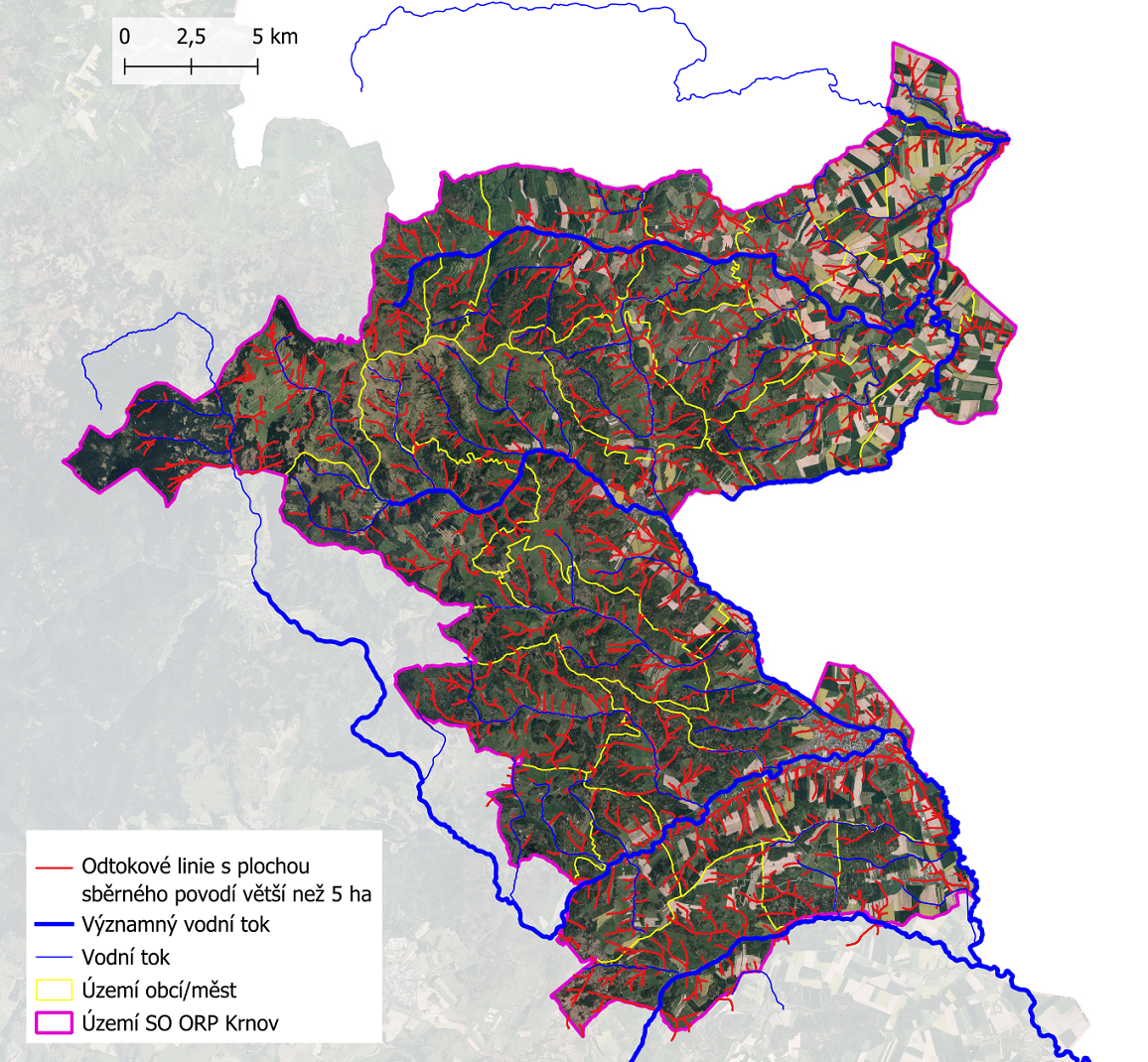 V rámci projektu "Strategie ochrany před negativními dopady povodní a erozními jevy přírodě blízkými opatřeními v České republice" byla vytvořena mapová kompozice odtokové poměry, z níž je čerpáno v následujícím grafickém výstupu. Jedná se o identifikaci odtokových linií (dráhy přímého povrchového odtoku) s přispívající plochou povodí > 5 ha. Tyto odtokové linie mohou dát za vznik soustředěnému povrchovému odtoku, který může způsobit škody na území SO ORP Krnov. Odtokové linie nezohledňují aktuální využití pozemků ani jiné skutečnosti, které mají vliv na přerušení soustředěného povrchového odtoku.