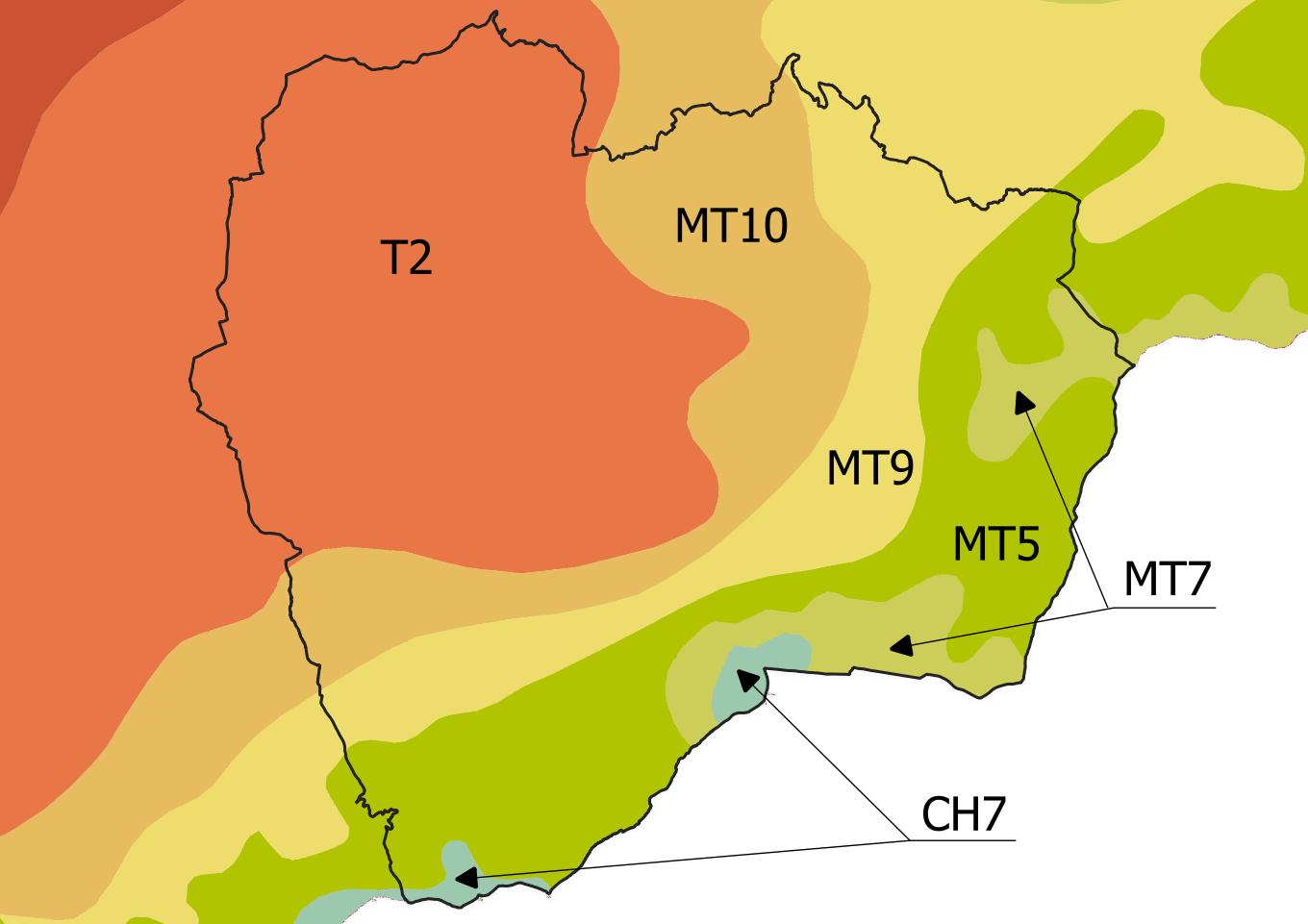 Oblast T2 se vyznačuje létem dlouhým, teplým a suchým. Přechodné období je krátké a mírné. Zima je krátká, mírně teplá, suchá až velmi suchá s velmi krátkou dobou trvání sněhové pokrývky.