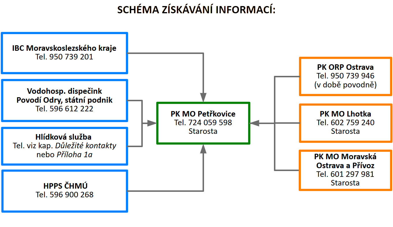 | 1 | Dlouhodobý déšť / tání / ledové jevy | Monitorování údajů vodoměrných stanic, sledování hydrologických údajů na webových stránkách podniku Povodí Odry, státní podnik a ČHMÚ. | Předseda PK, členové PK | Podnik Povodí Odry, státní podnik; ČHMÚ |