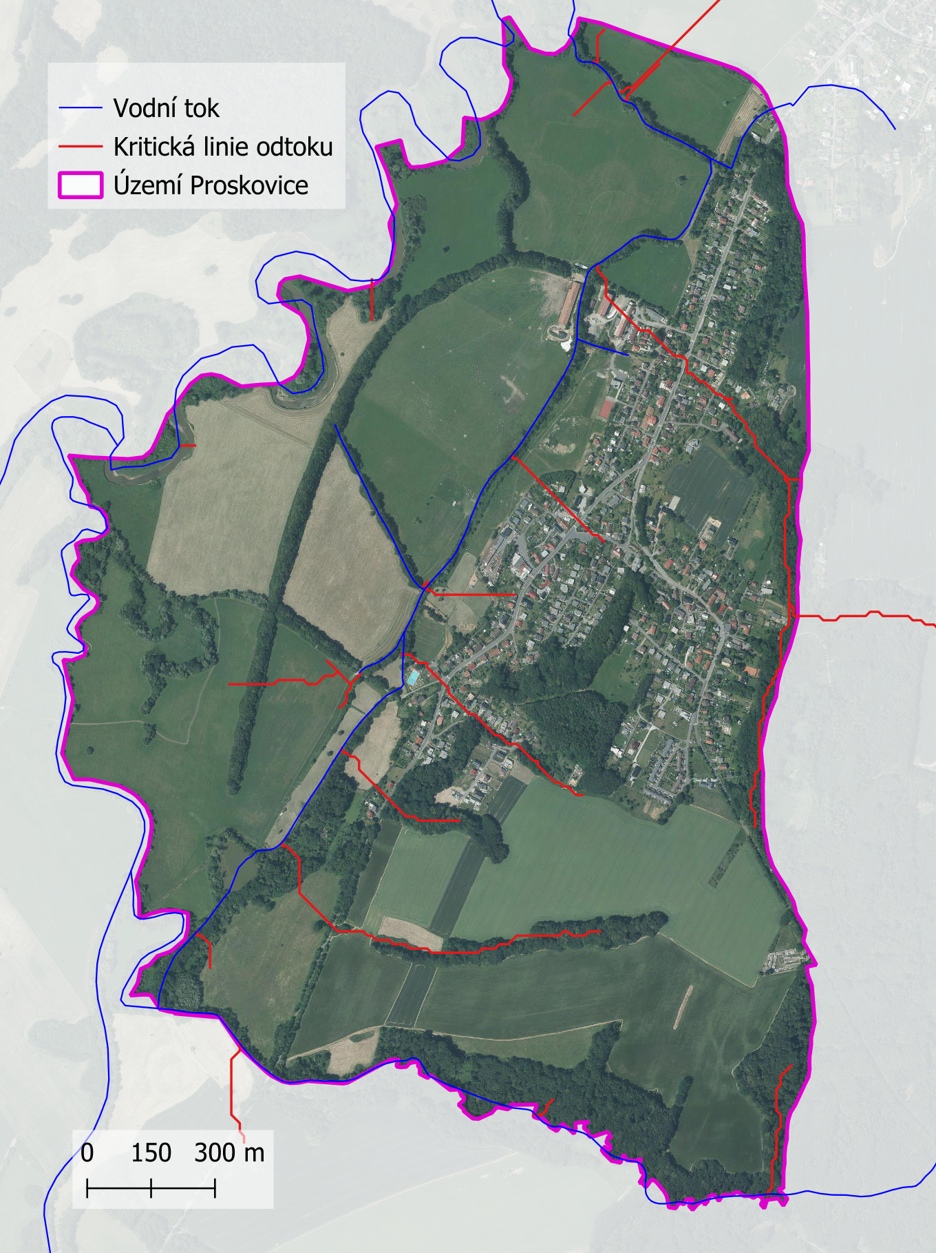 V rámci projektu "Strategie ochrany před negativními dopady povodní a erozními jevy přírodě blízkými opatřeními v České republice" byla vytvořena mapová kompozice odtokové poměry, z níž je čerpáno v následujícím grafickém výstupu. Jedná se o identifikaci odtokových linií (dráhy přímého povrchového odtoku) s přispívající plochou povodí > 5 ha. Tyto odtokové linie mohou dát za vznik soustředěnému povrchovému odtoku, který může způsobit škody na území městského obvodu Proskovice. Odtokové linie nezohledňují aktuální využití pozemků ani jiné skutečnosti, které mají vliv na přerušení soustředěného povrchového odtoku.