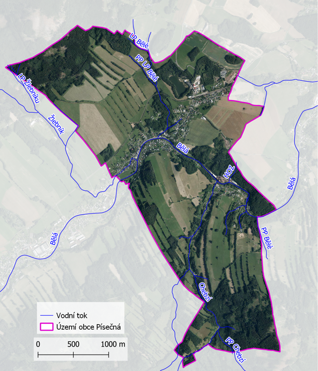Nejvýznamnější vodní tok, z hlediska povodňového ohrožení, na území obce Písečná je Bělá. Řeka pramení pod Videlským sedlem v centrální části Hrubého Jeseníku v nadmořské výšce 870 m. Do území obce proniká z jihozápadu a lemuje zastavěné území a následně na východě obec opouští. Následně pokračuje na území Širokého Brodu a Mikulovic. Severovýchodně od Mikulovic v nadmořské výšce 300 m protéká na hranicích s Polskem a opouští ČR. V Polsku ústí do Kladské Nisy, levostranného přítoku Odry u Glębinowského jezera poblíž polského města Nisa. Délka vodního toku je 54,9 km a plocha povodí je 396 km2.