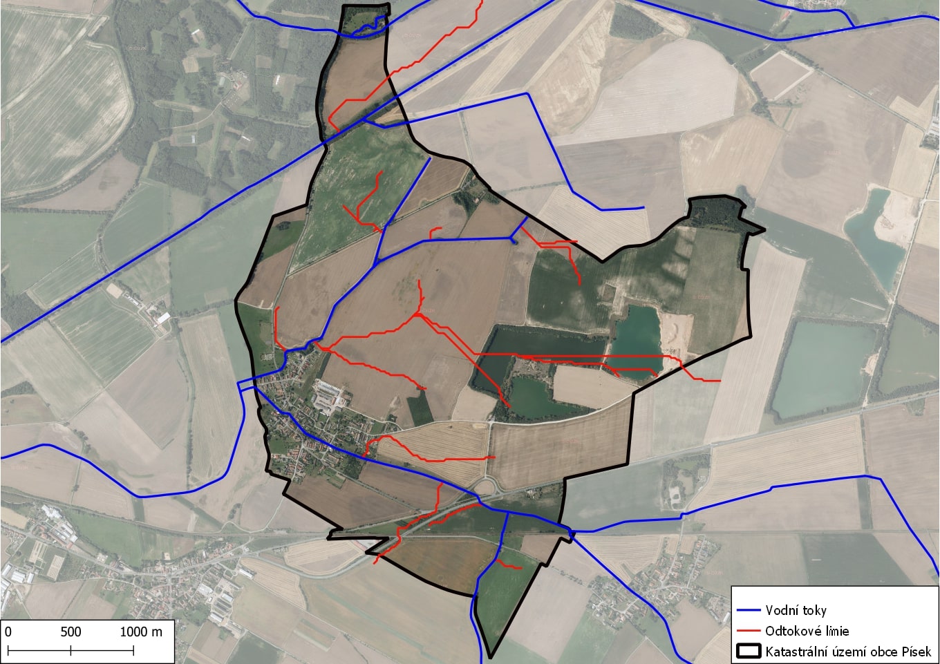 V rámci projektu "Strategie ochrany před negativními dopady povodní a erozními jevy přírodě blízkými opatřeními v České republice" byla vytvořena mapová kompozice odtokové poměry, z níž je čerpáno v následujícím grafickém výstupu. Jedná se o identifikaci odtokových linií (dráhy přímého povrchového odtoku) s přispívající plochou povodí > 5 ha. Tyto odtokové linie mohou dát za vznik soustředěnému povrchovému odtoku, který může způsobit škody na území obce Písek. Odtokové linie nezohledňují aktuální využití pozemků ani jiné skutečnosti, které mají vliv na přerušení soustředěného povrchového odtoku.