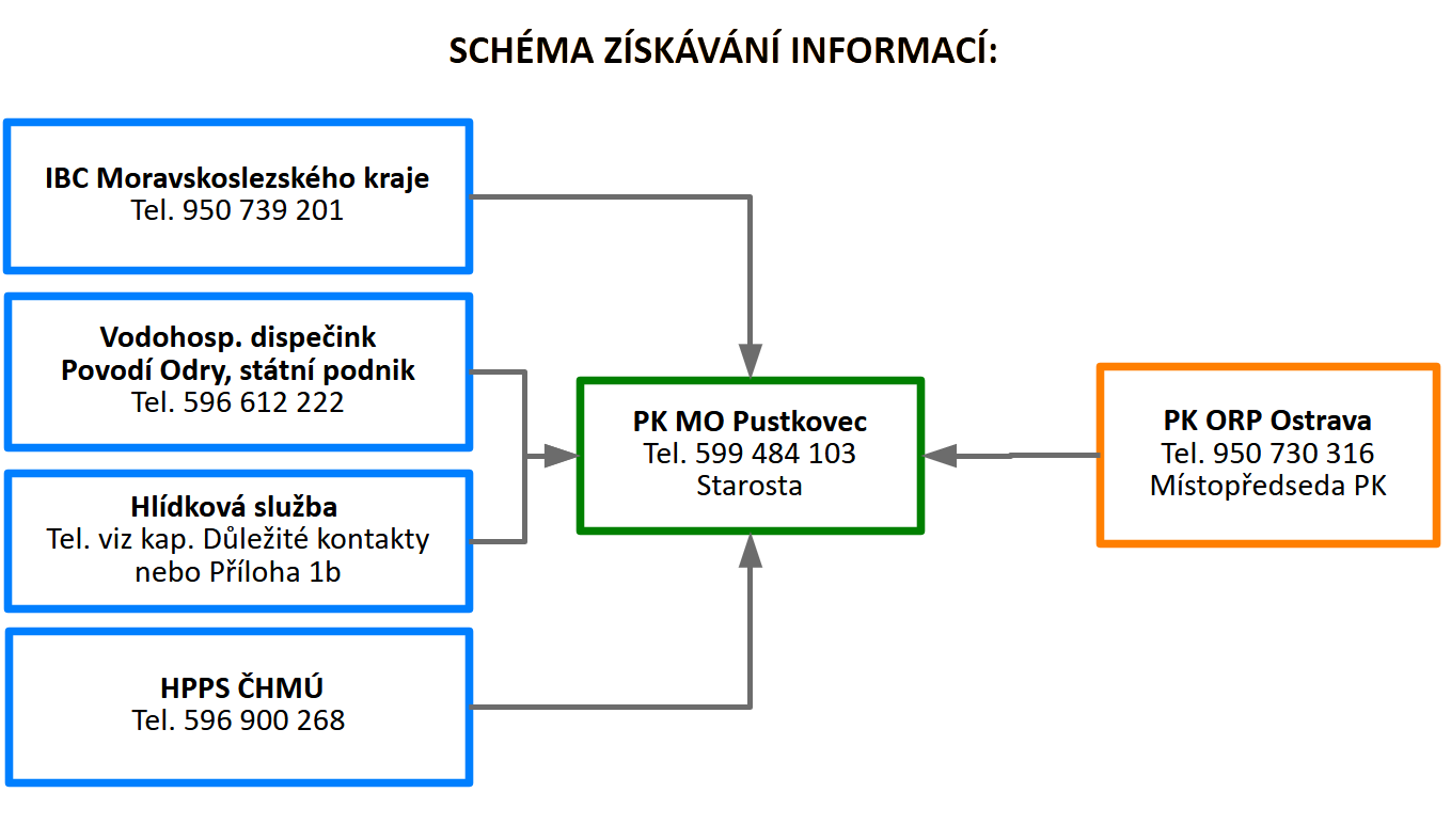 | 1 | Dlouhodobý déšť / tání / ledové jevy | Monitorování údajů vodoměrných stanic, sledování hydrologických údajů na webových stránkách podniku Povodí Odry, státní podnik a ČHMÚ. | Předseda PK, členové PK | Podnik Povodí Odry, státní podnik; ČHMÚ |