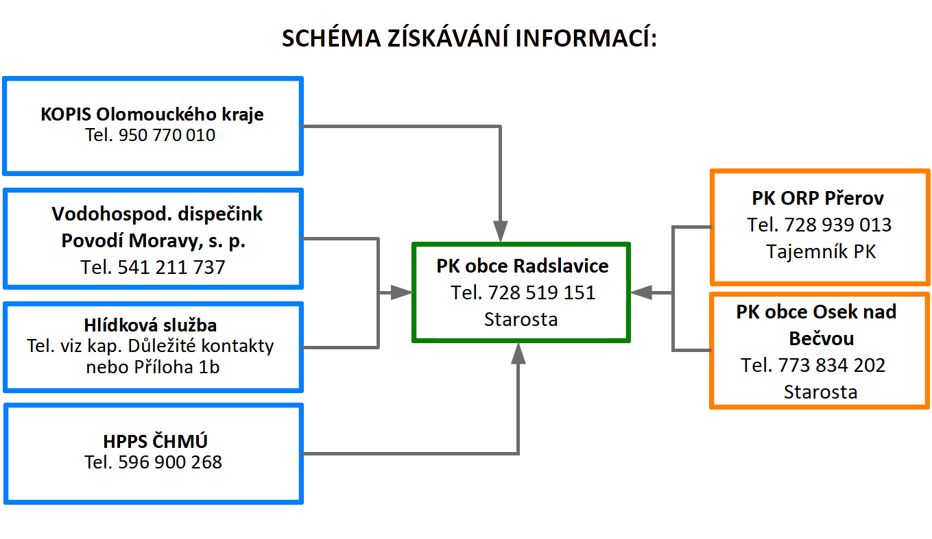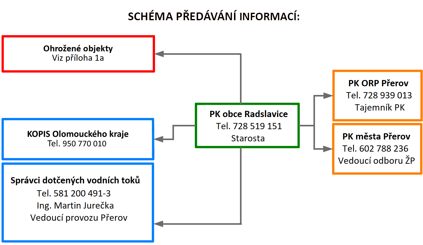 | 4 | Další vzestup hladin s nepříznivou prognózou | Svolání krizového štábu obce. | Předseda PK | KOPIS HZS Olomouckého kraje |