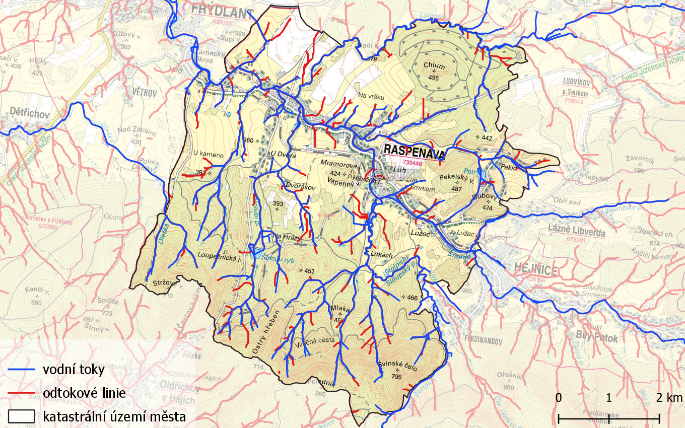 V rámci projektu "Strategie ochrany před negativními dopady povodní a erozními jevy přírodě blízkými opatřeními v České republice" byla vytvořena mapová kompozice odtokové poměry, z níž je čerpáno v následujícím grafickém výstupu. Jedná se o identifikaci odtokových linií (dráhy přímého povrchového odtoku) s přispívající plochou povodí > 5 ha. Tyto odtokové linie mohou dát za vznik soustředěnému povrchovému odtoku, který může způsobit škody na území města Raspenava. Odtokové linie nezohledňují aktuální využití pozemků ani jiné skutečnosti, které mají vliv na přerušení soustředěného povrchového odtoku.