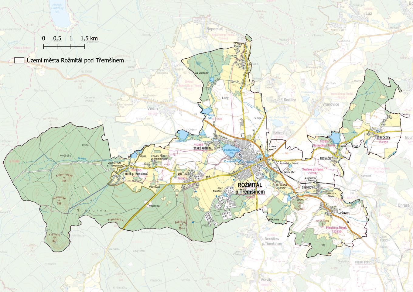 Celková rozloha řešeného území činí 5 301,3 ha. Níže uvedená tabulka popisuje procentuální podíly jednotlivých druhů využití pozemků, které se v území města vyskytují. Dle tabulky je zjevné, že majoritní zastoupení má v zájmovém území využití půdního fondu jako lesní půda (43,8 %).