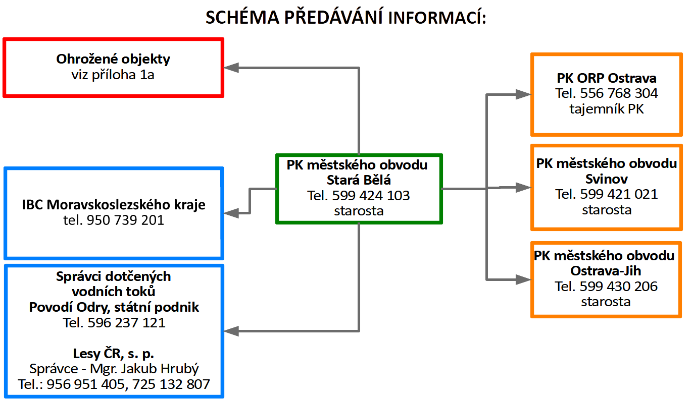 | 4 | Další vzestup hladin s nepříznivou prognózou | Svolání krizového štábu městského obvodu. | Předseda PK | IBC HZS Moravskoslezského kraje |