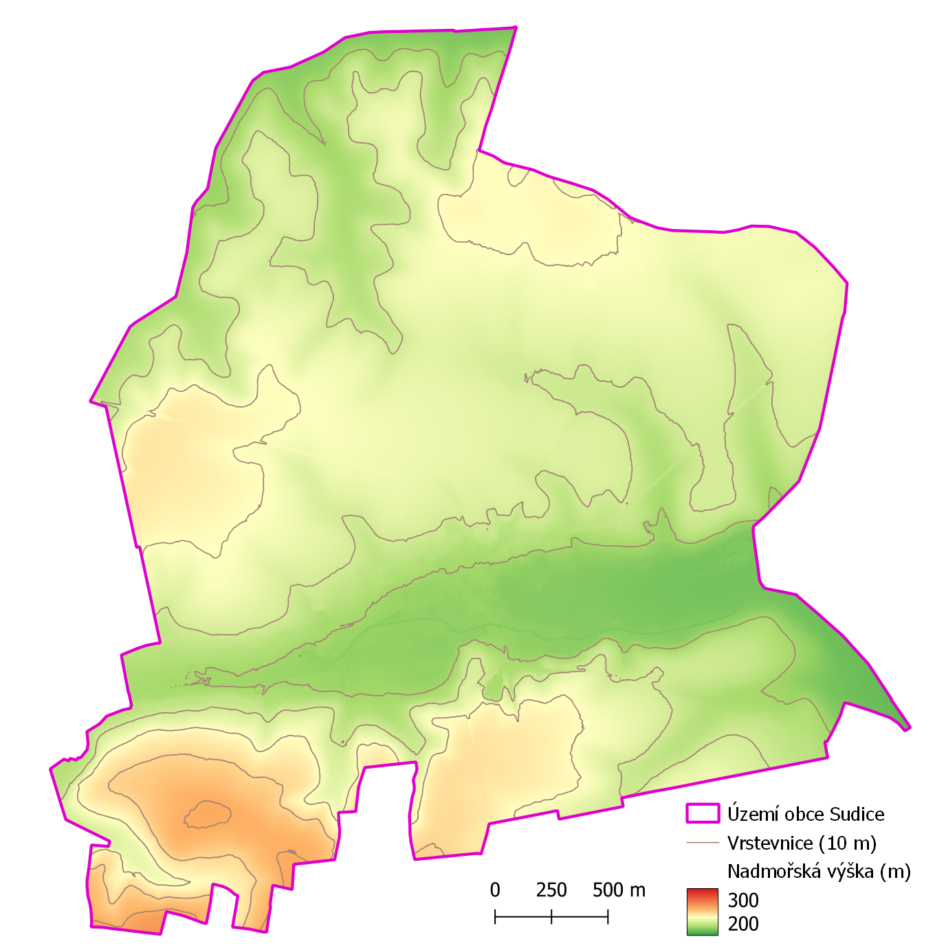 Terén v obci Sudice je mírně nakloněný, s nadmořskou výškou nejčastěji mezi 230 a 240 m. Směrem k jihu se terén dále zvedá, a to až do nadmořské výšky 260 m na jihovýchodní hranici katastru. Maximální nadmořská výška na území je 266,8 m. Medián sklonu svahů je 2,1°, kdy maximum je 89,2°.