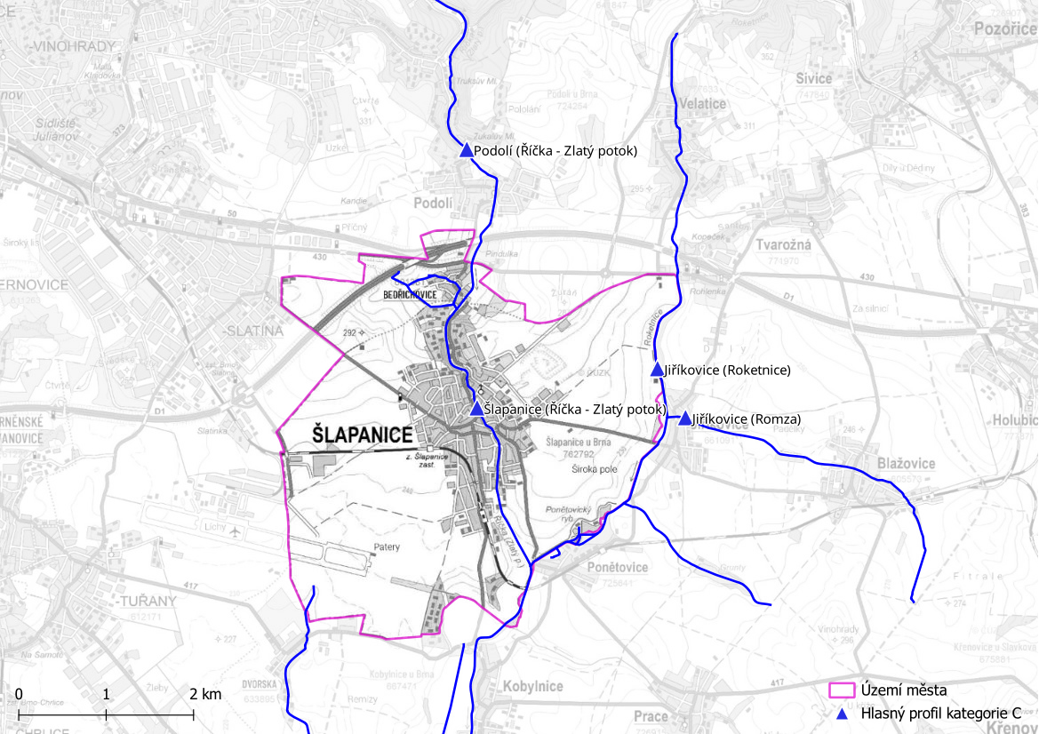Rozmístění relevantních hlásných profilů pro města Šlapanice