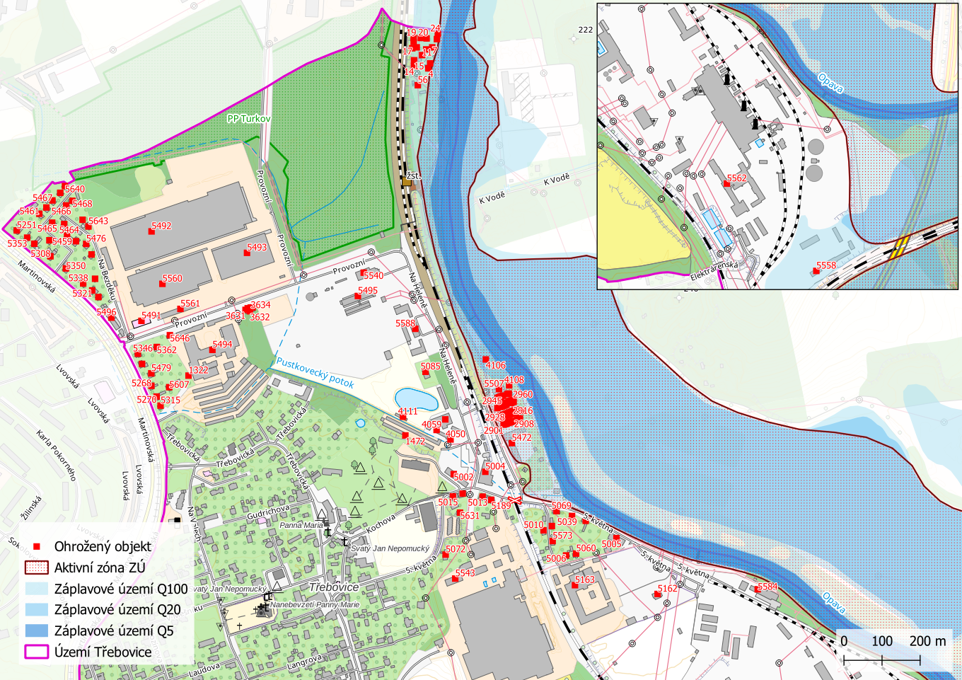 Ohrožené objekty na území městského obvodu Třebovice s záplavovým územím
