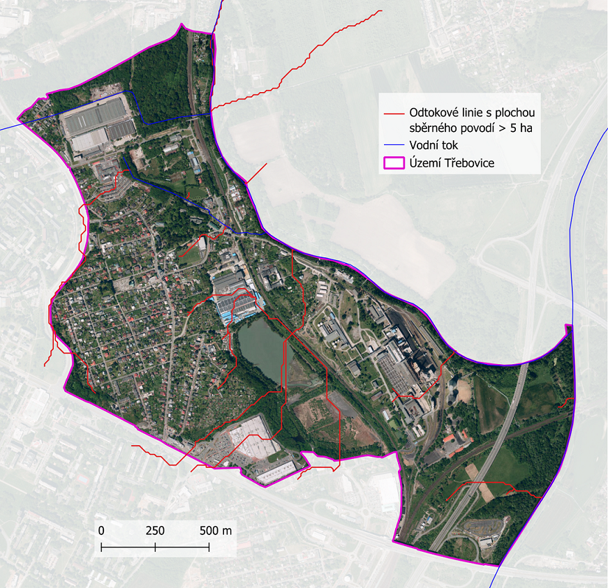 V rámci projektu "Strategie ochrany před negativními dopady povodní a erozními jevy přírodě blízkými opatřeními v České republice" byla vytvořena mapová kompozice odtokové poměry, z níž je čerpáno v následujícím grafickém výstupu. Jedná se o identifikaci odtokových linií (dráhy přímého povrchového odtoku) s přispívající plochou povodí > 5 ha. Tyto odtokové linie mohou dát za vznik soustředěnému povrchovému odtoku, který může způsobit škody na území městského obvodu Třebovice. Odtokové linie nezohledňují aktuální využití pozemků ani jiné skutečnosti, které mají vliv na přerušení soustředěného povrchového odtoku.
