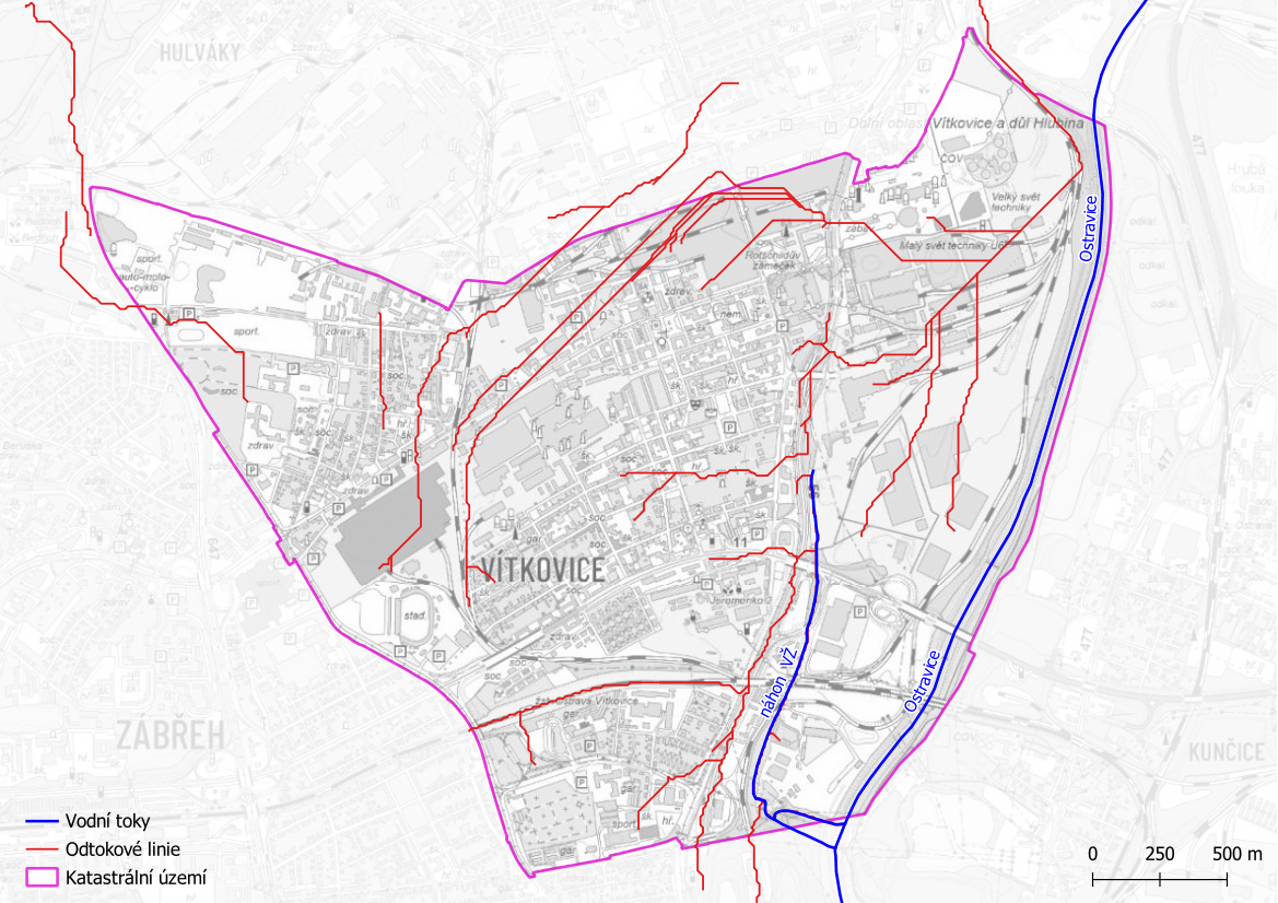 V rámci projektu "Strategie ochrany před negativními dopady povodní a erozními jevy přírodě blízkými opatřeními v České republice" byla vytvořena mapová kompozice odtokové poměry, z níž je čerpáno v následujícím grafickém výstupu. Jedná se o identifikaci odtokových linií (dráhy přímého povrchového odtoku) s přispívající plochou povodí > 5 ha. Tyto odtokové linie mohou dát za vznik soustředěnému povrchovému odtoku, který může způsobit škody na území městského obvodu Vítkovice. Odtokové linie nezohledňují aktuální využití pozemků ani jiné skutečnosti, které mají vliv na přerušení soustředěného povrchového odtoku.